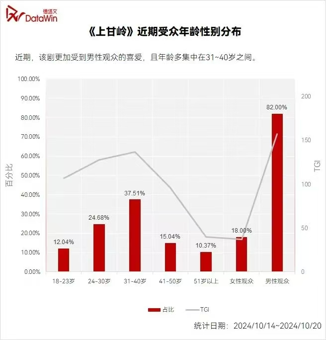 根据德塔文统计,它的30岁以上用户占比超过52%,女性观众仅占比18%,男性观众占比82%,是市场衡量标尺中典型的高龄段“男频剧”。
