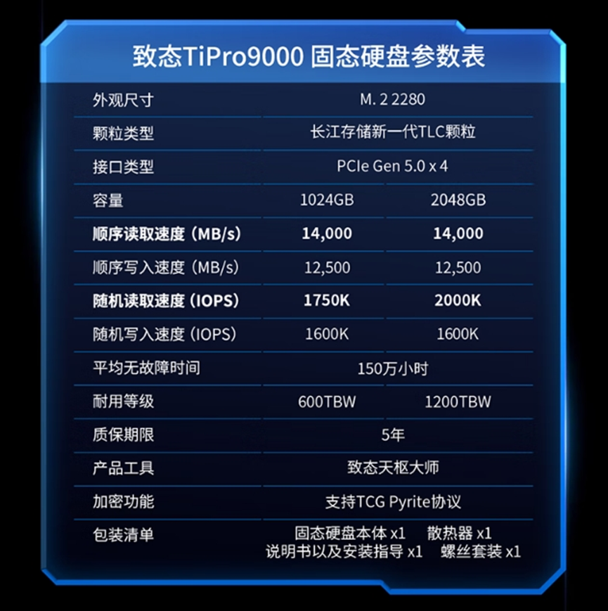 至于价格,毕竟定位 PCIe 5.0 旗舰 SSD,致态 TiPro9000 1TB 来到 959 元、2TB 1559 元。