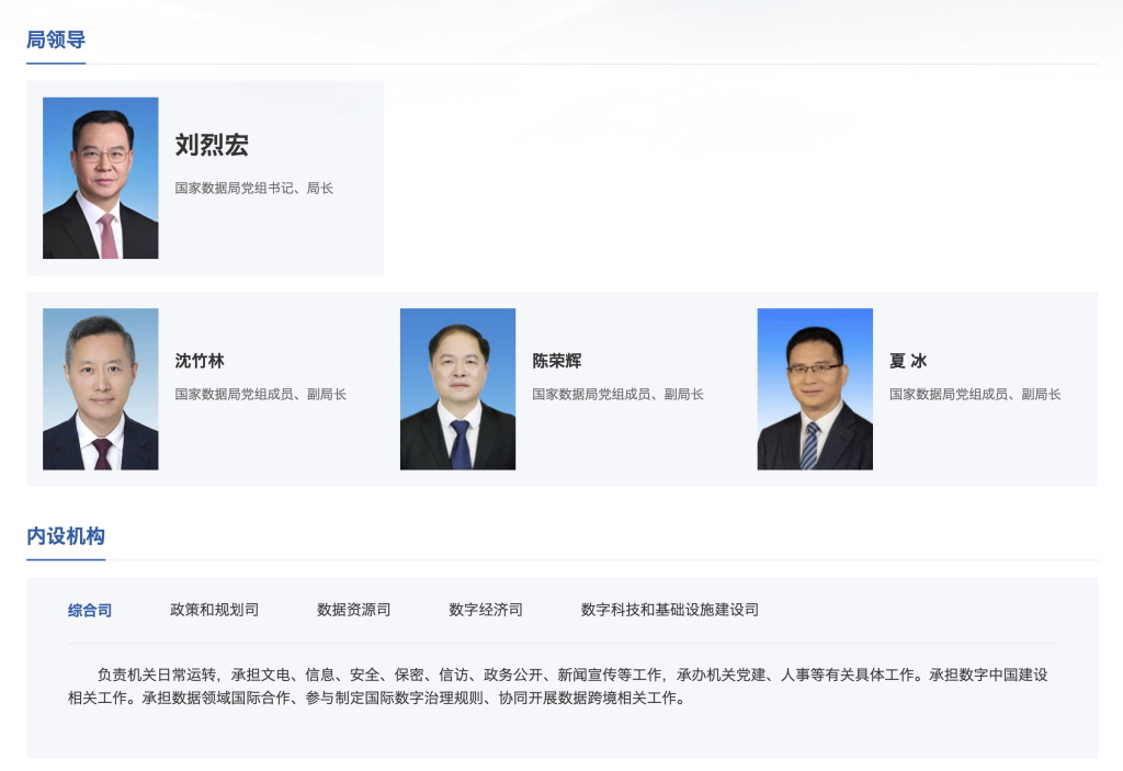 官网显示,国家数据局领导共有四位,分别是国家数据局党组书记、局长刘烈宏,以及三位国家数据局党组成员、副局长沈竹林、陈荣辉、夏冰。