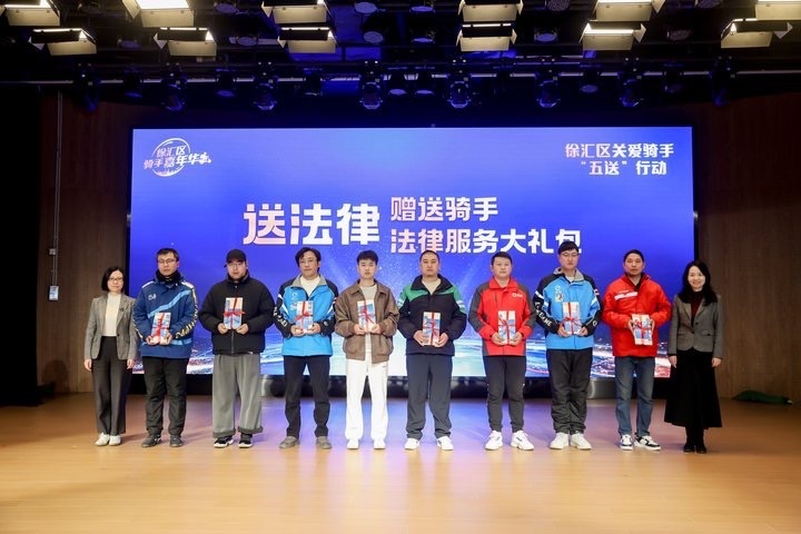 同时,关心关爱骑手“五送”行动重磅推出。“送法律”,区总工会联合区司法局、区法院、区检察院、区交警支队共同为骑手们送去法律服务大礼包,提供“工会+”法律维权服务和专业法律咨询,增强其法律意识与权益保护能力;“送心愿”,全国劳模滕平、王承,全国五一劳动奖章获得者胡志红、市劳模余美香、余琛等现场“点亮”了骑手们的微心愿,送去双肩包、儿童自行车、微波炉、羽绒服等物品,市劳模叶莎、董伟、张敏虽然无暇来到现场,但也把认领的心愿礼物带到了现场,真正传递社会各界的温暖与关怀;“送文化”,区文旅局会同区总工会发布了2025年服务骑手的两大文化服务举措,现场会同上影集团为小哥们送去电影观摩大礼包等丰富的精神食粮,提升骑手文化素养;“送技能”,区总工会为在市总工会第三届网约配送员职业技能大赛中取得优异成绩的闪送代表团及一等奖骑手王静等颁发荣誉证书,鼓励并倡导骑手自觉提升专业技能常态化;“送温暖”,来自部分街道的总工会主席为骑手送去挡风被、护膝、手套等特温暖的防寒大礼包,让他们在寒冬中感受工会娘家人的温情。