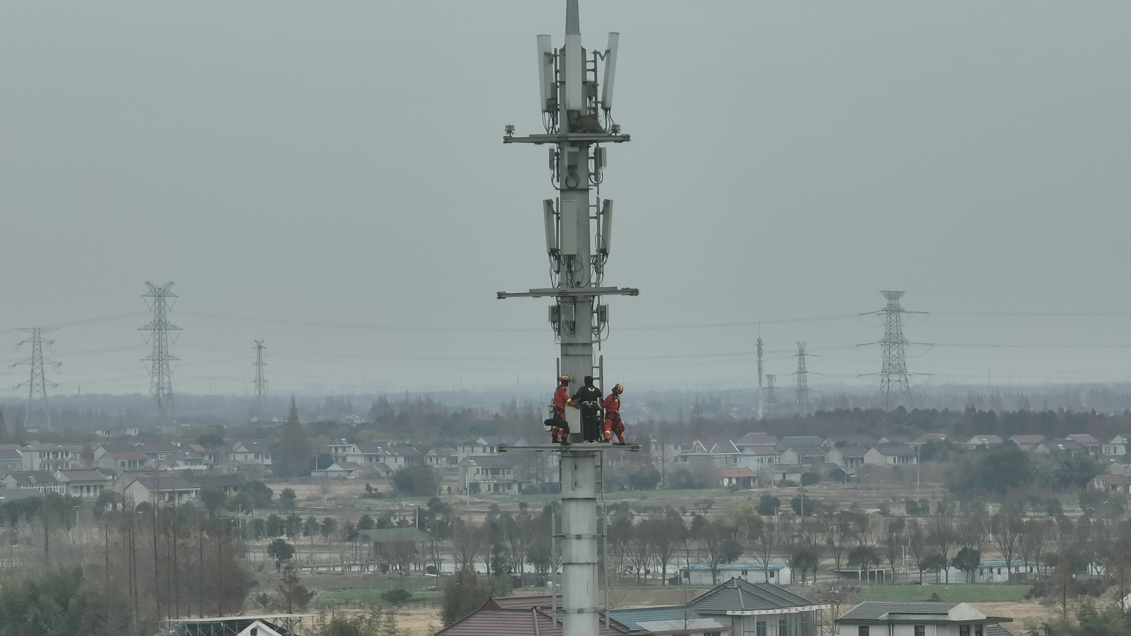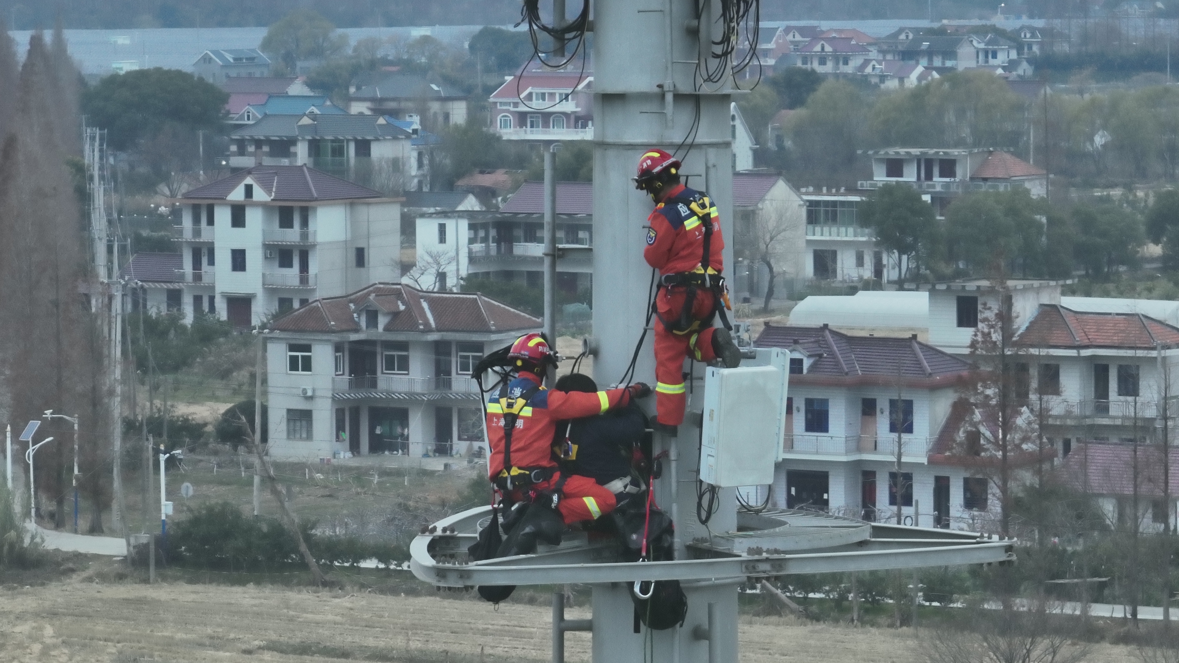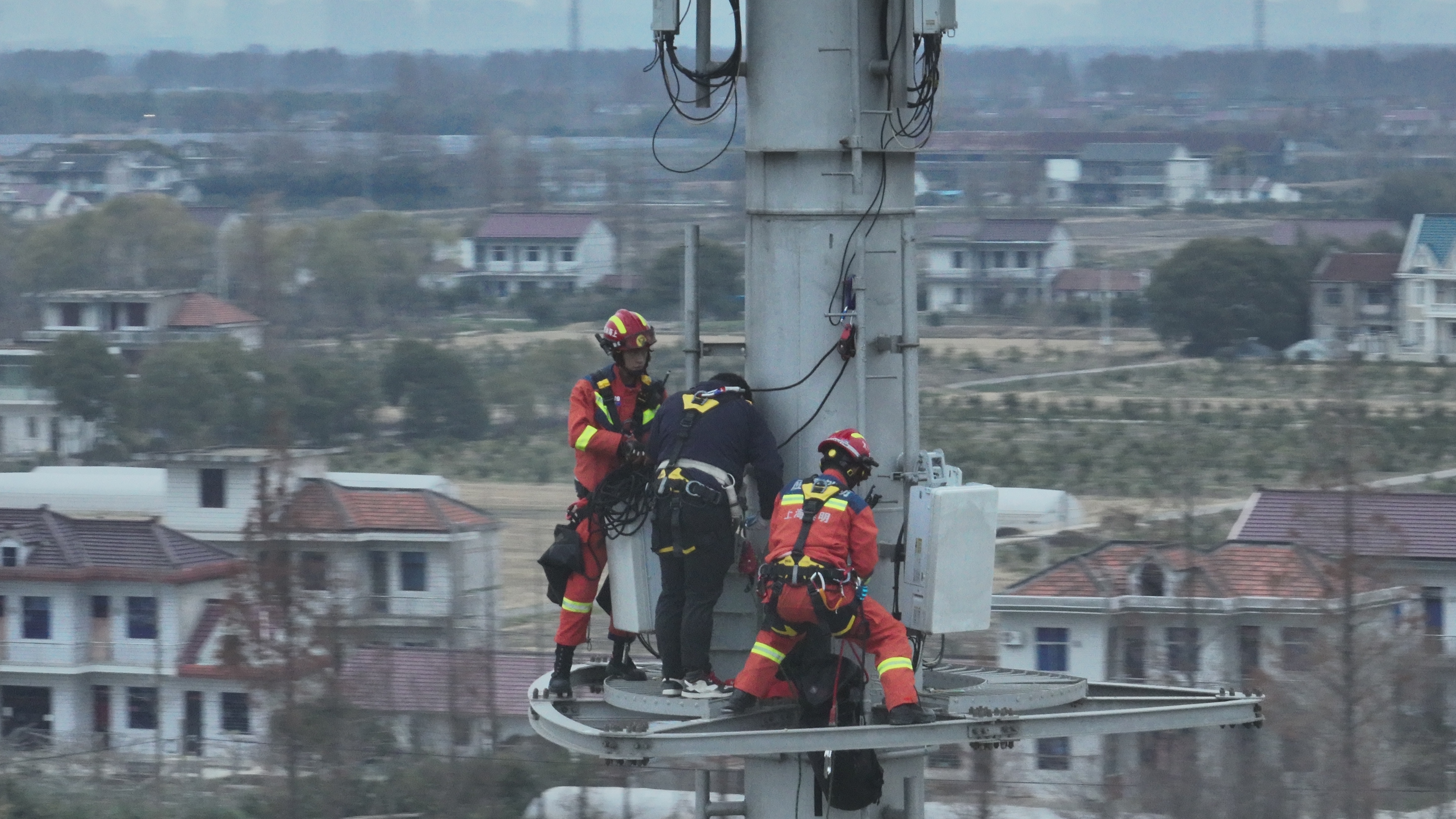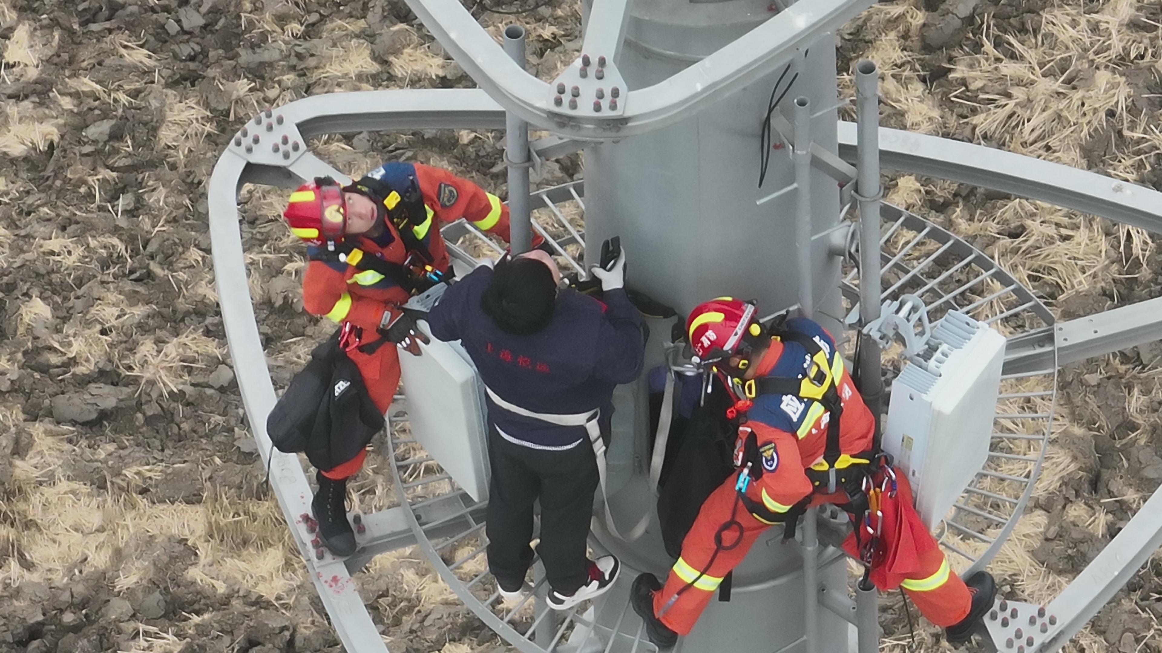 消防救援人员到场后经侦查发现,一名工作人员被困在信号塔上,所处位置接近塔顶的设备区域,距离地面约30米。正值冬季傍晚,气温逐降,加之视线模糊,情况十分紧急。