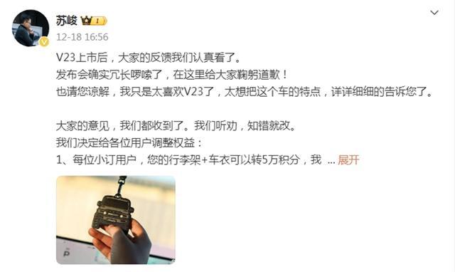好在iCAR V23是比较听劝的,听到客户的反馈声音后,智米科技创始人CEO、iCAR汽车首席产品官苏峻表示向大家鞠躬道歉,也承认了发布会冗长啰嗦的问题,只是自己太喜欢这款产品,想把TA的特点详详细细地呈现在观众眼前。