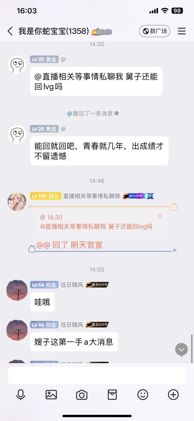 FPS小助手写道:“根据Starry姐姐在姐夫sideny粉丝群的爆料,Starry即将返回LVG,或将明天官宣。ps:不排除是小舅子的姐姐在粉丝群开玩笑,一切以官方信息为准。”