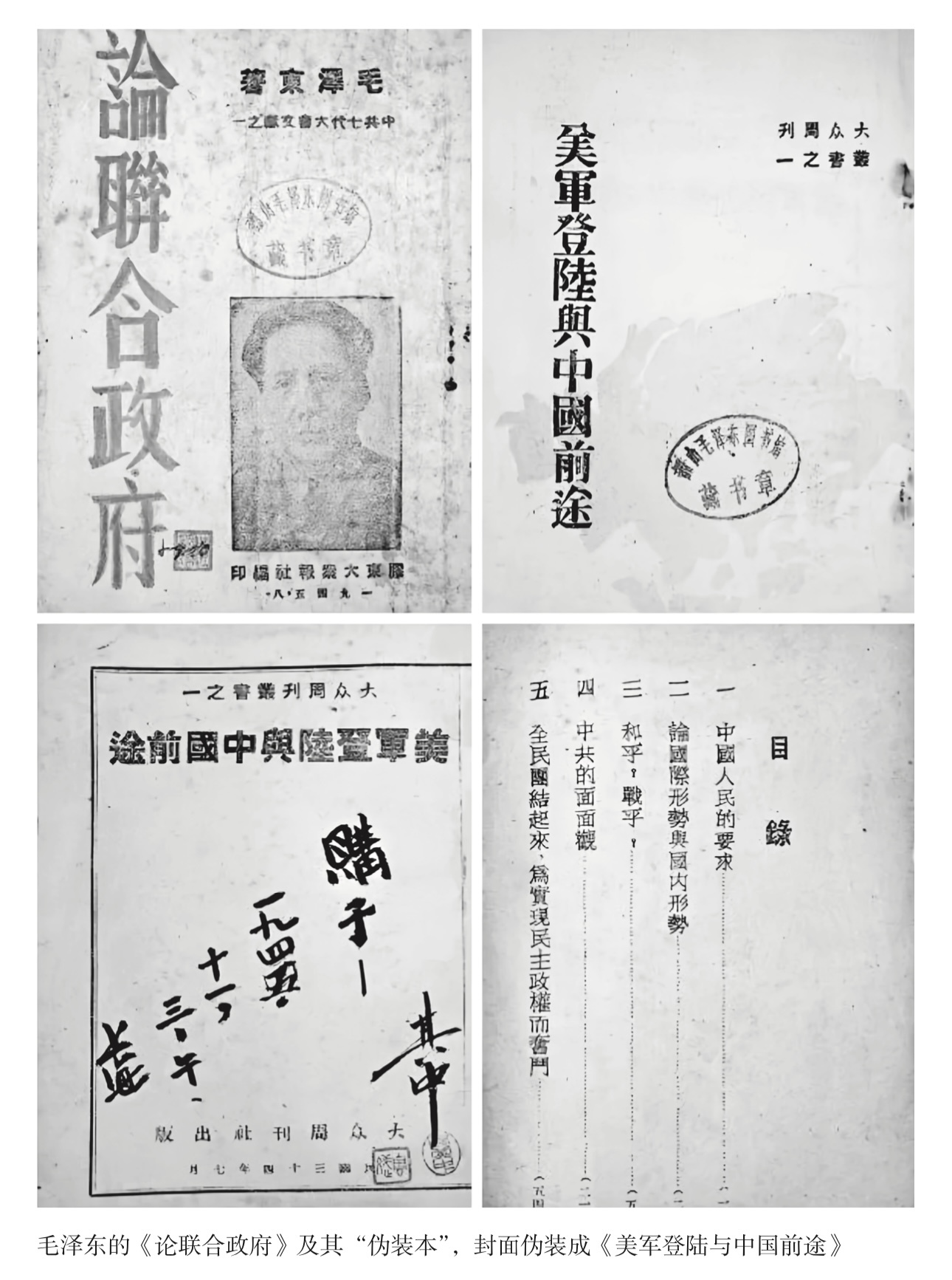 毛泽东这篇《论联合政府》的报告,当年5月就先后由太岳新华书店、涉县新华书店、救国报社、渤海新华书店、联政和解放社等相继出版了9种单行本。此后又陆续出版的单行本多达260多种。这些单行本中,有7种是以“伪装本”形式发行流通的。《美军登陆与中国前途》便是其中之一。