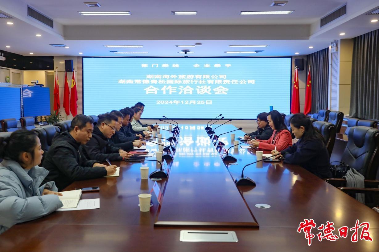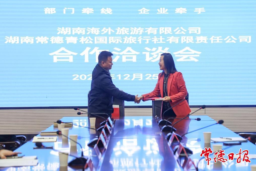 常德日报记者 裴维维 通讯员 汪洋 文/图 12月25日 ,在常德市文旅广体局牵线搭桥下,湖南海外旅游有限公司(以下简称“湖南海外旅游”)董事长蒋燕妮一行来到常德,与湖南常德青松国际旅行社有限责任公司(以下简称“常德青松国旅”)开展合作洽谈。双方就共同出资、经营湖南海外旅游常德有限公司达成共识,并成功签订战略合作协议。