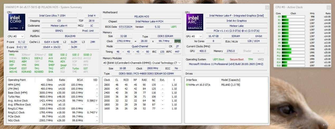 本代磐镭 HO5所有套装均搭载了相同的处理器——Intel 酷睿 Ultra 7 155H。这款移动端标压低功耗处理器采用英特尔最新的分离式架构设计,集成了 CPU、NPU 及 GPU 等多个核心模块,突出了第十四代酷睿在技术创新上的显著进步。依托 Intel 4 工艺制程,它在性能、能效和散热表现方面都有出色的提升。