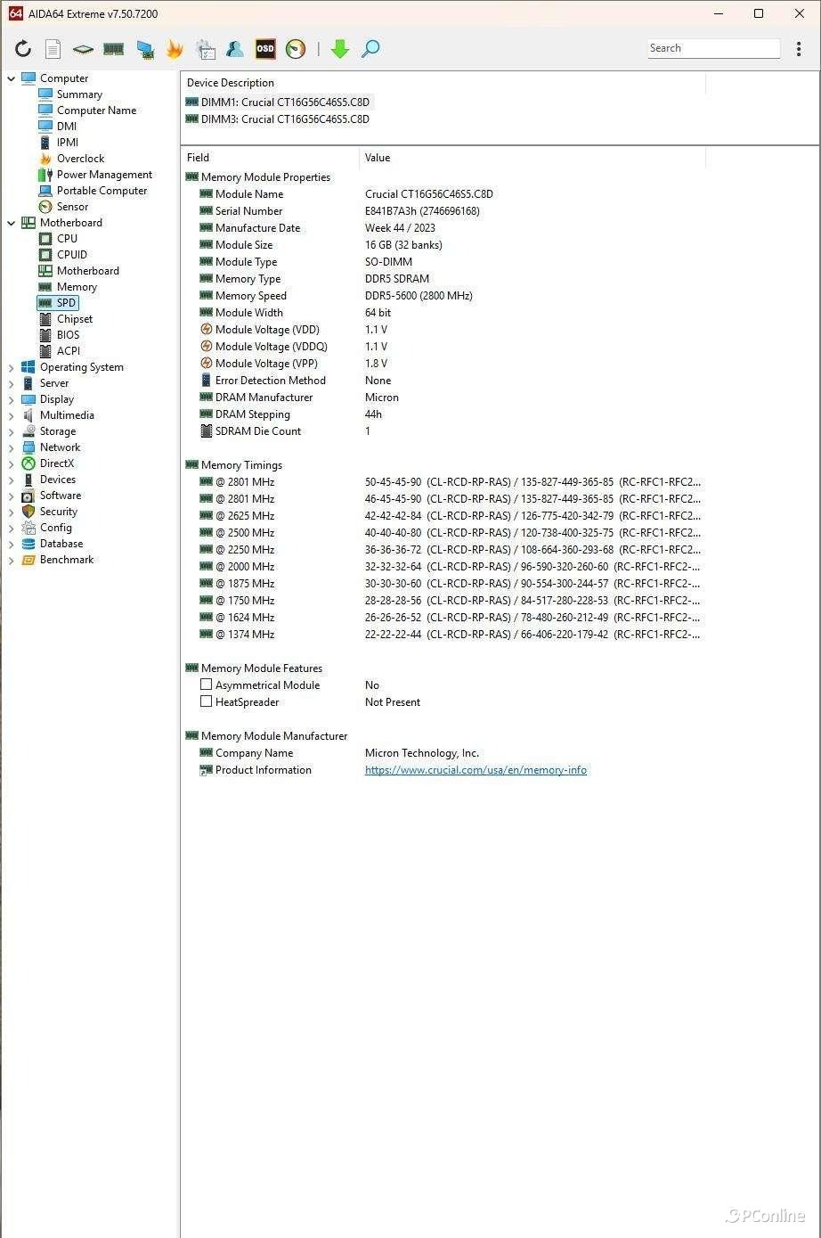其他关键硬件方面,本次套装提供了两条英睿达 DDR5-5600 16GB 内存(镁光颗粒),组建 32GB 双通道高频配置。在 AIDA64 Cache & Memory Benchmark 中得到了 78,990 MB/s 的读取、71,232 MB/s 的写入与 74,326 MB/s 的复制速度,延迟仅为 151.5 ns,能够为高强度多任务处理提供充裕带宽。