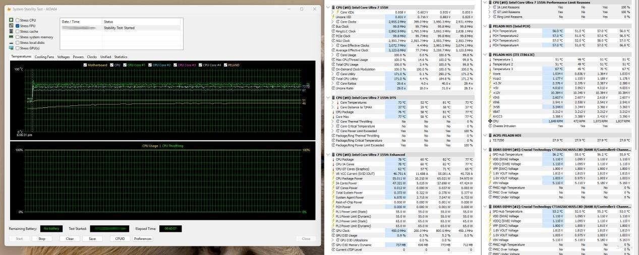 在满载运行的 FPU 烤机测试中,HO5处理器全核频率可稳定在 3.0 GHz上下,温度最高 78°C,显示出极佳的散热表现,难能可贵的是在此期间并未触发功耗墙。处理器封装功耗最高 55.01W,核心功耗为 37W,动力与能效兼具。整机主板温度维持在 51~57°C,内存温度 55°C 左右,均处在安全范围。