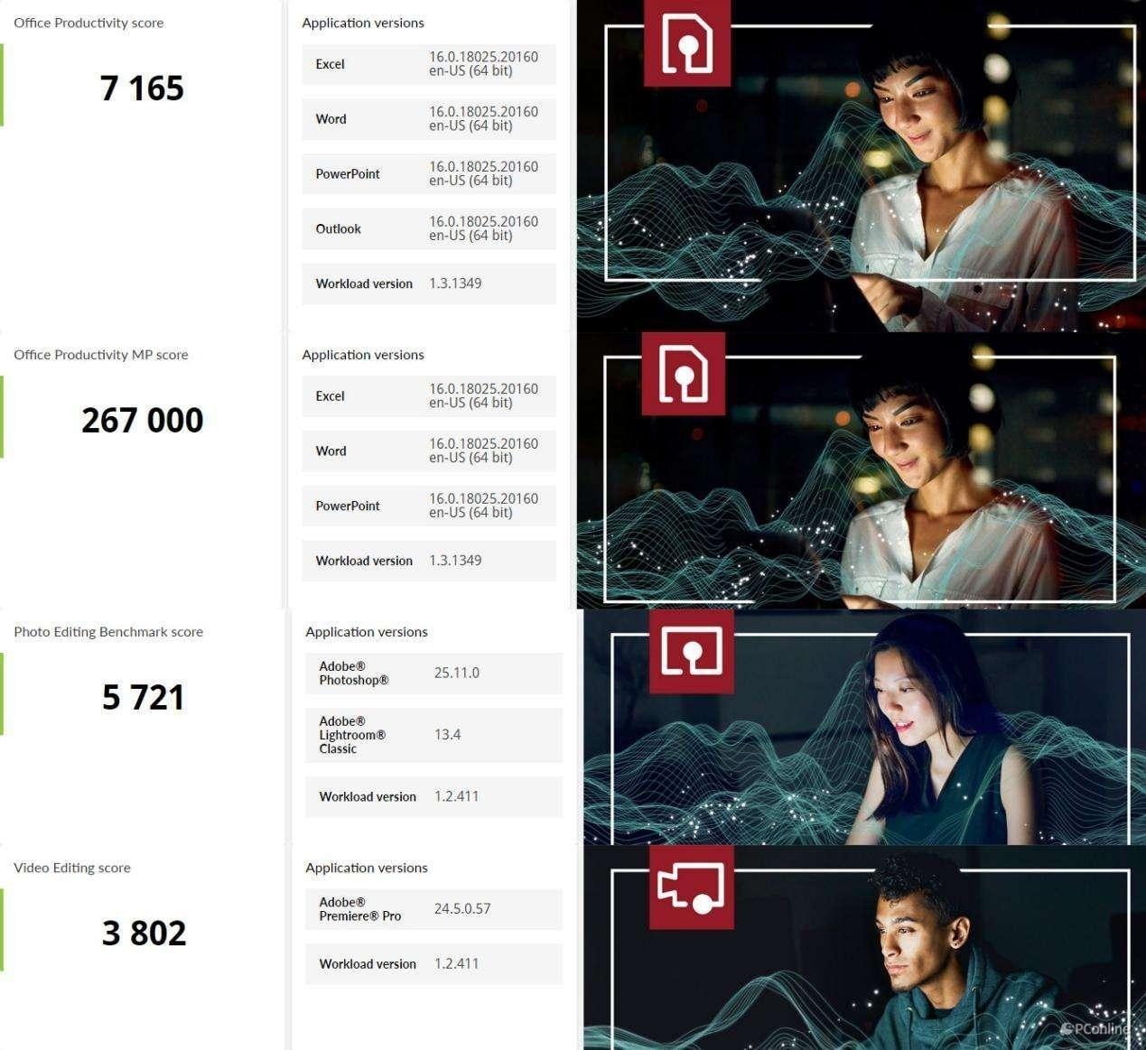 在具体测试中,Ultra 7 155H 在 Excel、Word 及 PowerPoint 中的单线程性能达到 7,165 分,多线程性能则突破 267,000 分,体现了对高强度办公场景的从容应对。图像编辑测试成绩同样亮眼,Photoshop 和 Lightroom 综合得分达 5,721 分,无论是图层操作、滤镜应用还是高分辨率图片批量处理都可快速完成,极具效率,十分适合摄影师和设计师。视频编辑方面,Ultra 7 155H 在 Adobe Premiere Pro 测试中获得 3,802 分,可胜任日常轻量级的视频剪辑与渲染需求。
