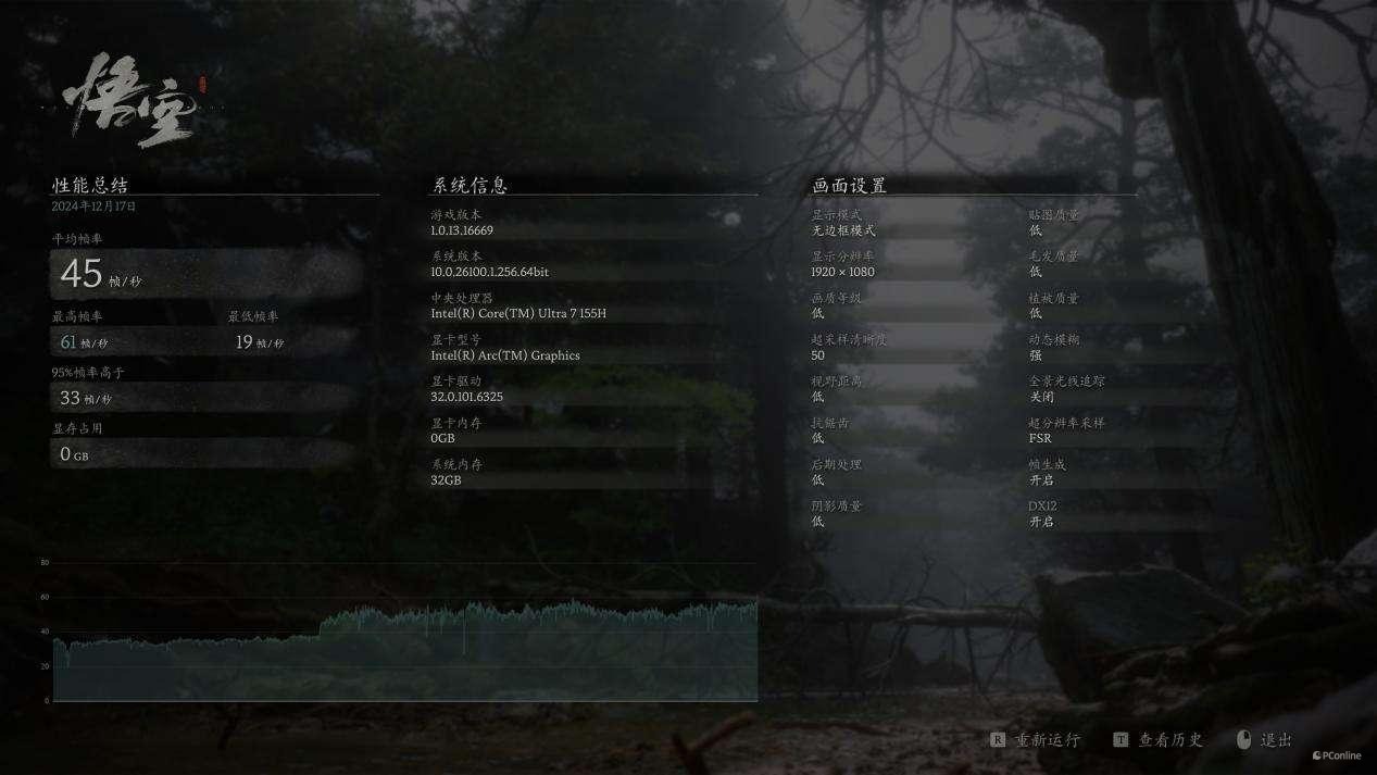 在年度 3A 大作《黑神话:悟空》的测试中,Ultra 7 155H 同样展现了良好的适应能力。即便在 1080p 分辨率、低画质设置,且开启 FSR 与 50% 超采的条件下,仍可获得平均 45 FPS 的帧率表现,最高帧率为 61 FPS,最低帧率为 19 FPS;在 95% 帧率分布中,帧率能稳定在 33 FPS 左右,大部分场景下运行体验比较流畅。