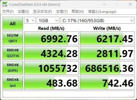 硬盘部分则采用了 1TB PCIe 4.0 NVMe SSD,内部是东芝 162 层 BiCS6 TLC 颗粒与 Phison PS5027-E27 主控的组合方案,配合合理的散热设计。CrystalDiskMark 测试数据显示,其顺序读取速度可达 6,992.76 MB/s,顺序写入速度 6,217.45 MB/s,随机读取速度 4,324.28 MB/s,随机写入速度 2,811.97 MB/s;4K IOPS 读写分别达到 1,055,732 和 686,516,足以胜任高负载环境下的快速响应需求。