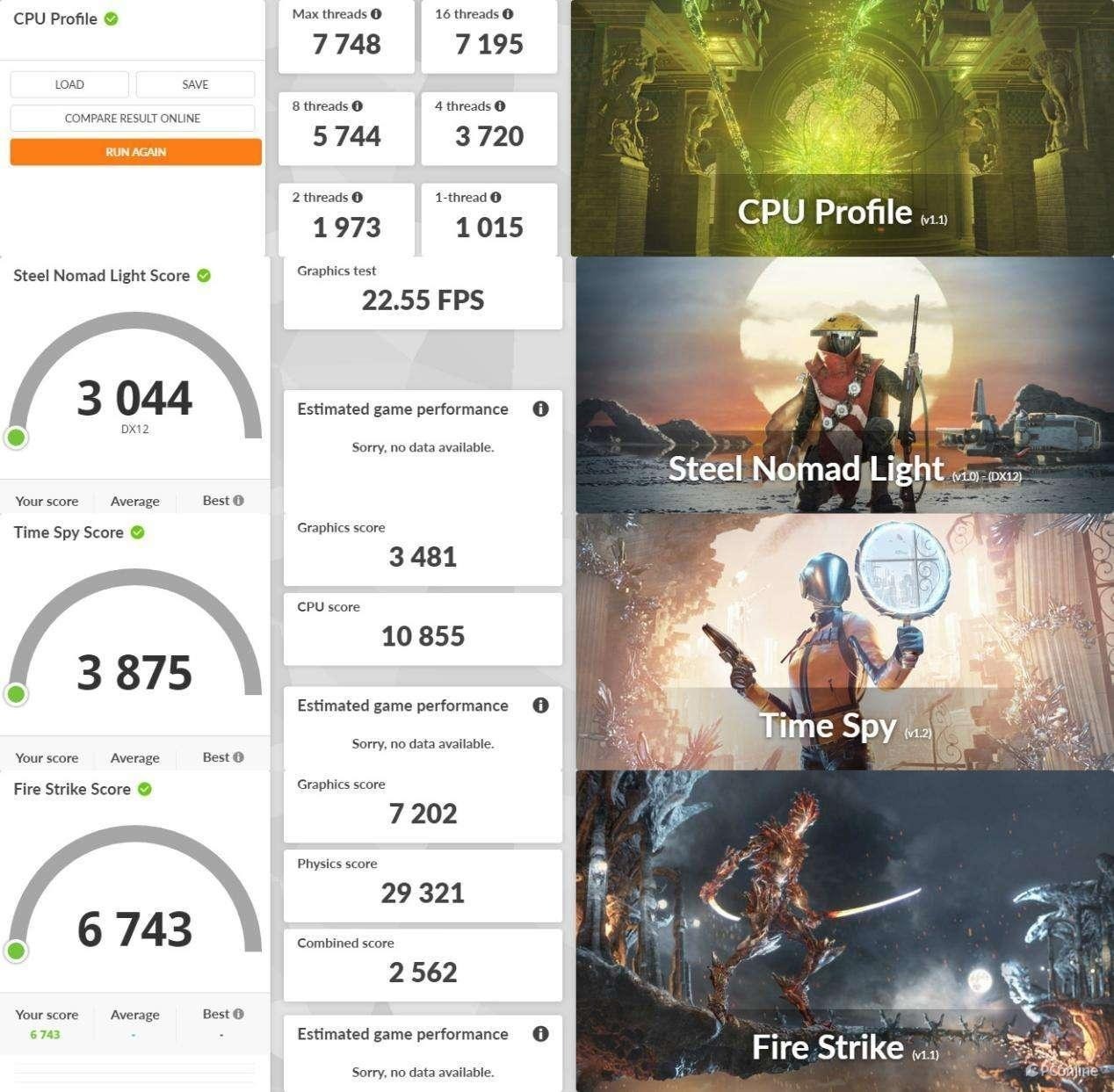 从 3DMark 一系列测试数据来看,Ultra 7 155H 的图形性能表现相当不俗:在 Time Spy 测试中综合得分达到 3,875 分,其中图形得分为 3,481 分,CPU 得分高达 10,855 分;Fire Strike 测试的综合得分则为 6,743 分,图形得分 7,202 分,物理得分更是达到了 29,321 分。在 Steel Nomad Light DX12 场景中,平均帧率达 22.55 FPS,虽然与高端独立显卡仍有一定差距,但就集成显卡而言已十分出色。