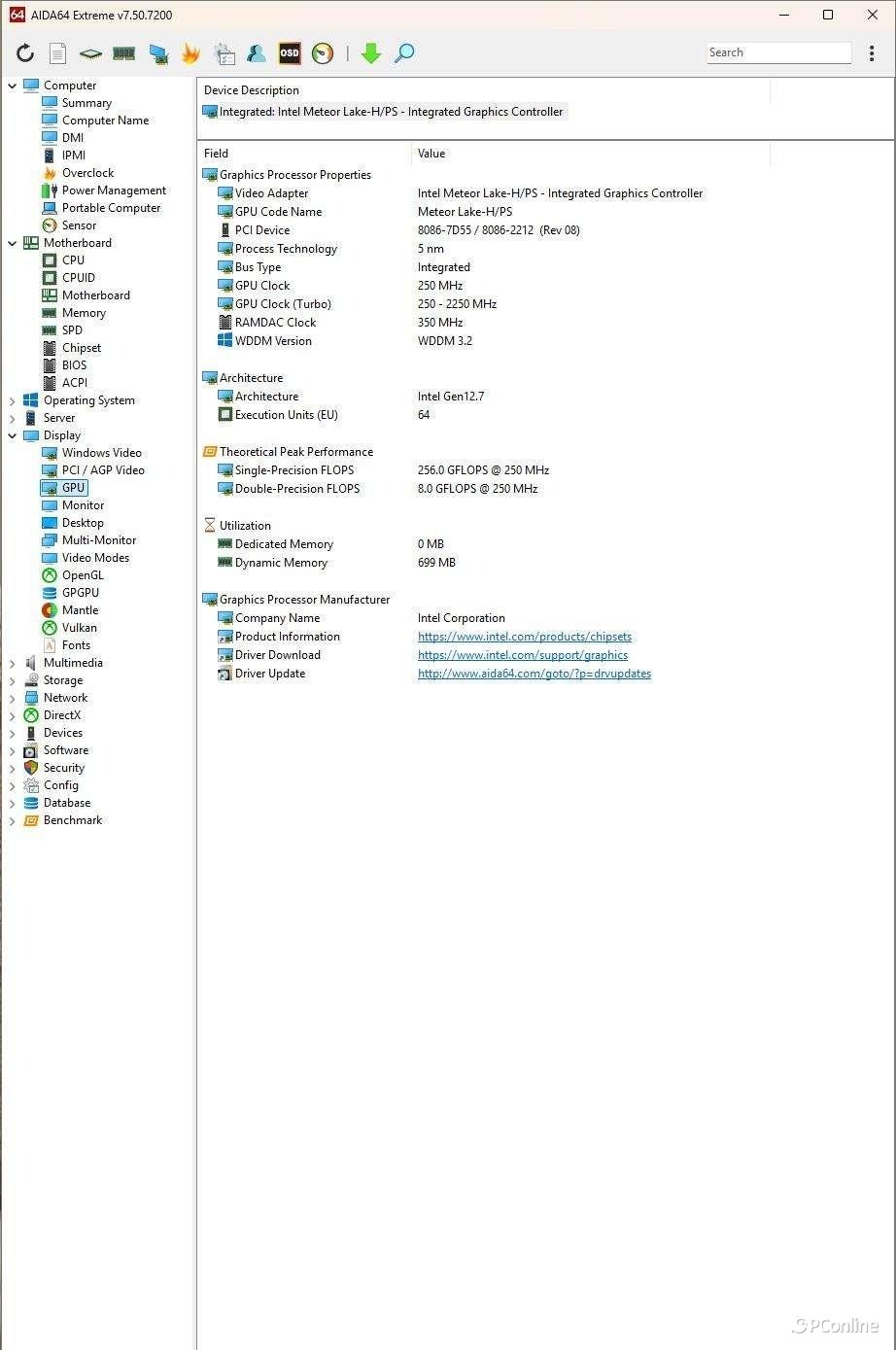 在核显性能方面,Ultra 7 155H 集成了 Intel Iris Xe 8 Core Graphics核显,配备多达 128 个 EU 执行单元、0.6 GHz 的基础频率以及高达 2.25 GHz 的最大睿频。与第十三代架构(Iris Xe Graphics 96 EUs,Alder Lake)相比,新一代核显的性能几乎翻倍,甚至逼近 GTX 1650 这类入门级独显的水平。