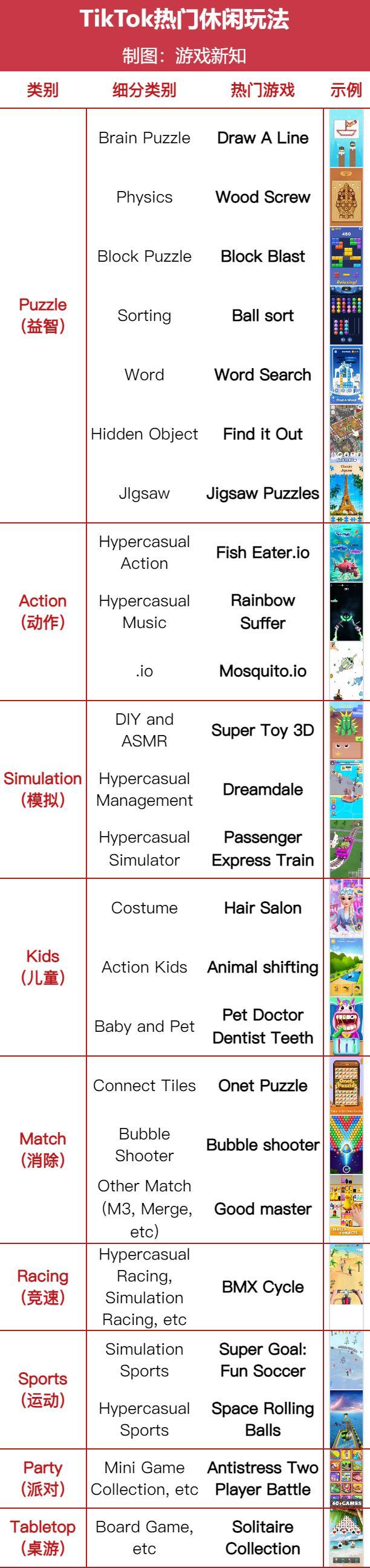 不得不说,TikTok的平台调性与休闲游戏极其适配。有数据表明,相较重度玩法内容,轻度玩法&元素在TikTok更受欢迎,点击率和互动率往往能提高8%或15%。一份来自权威机构的分析报告向我们展示了TikTok上热门的休闲玩法,其与全球休闲游戏市场的大趋势总体是一致的。