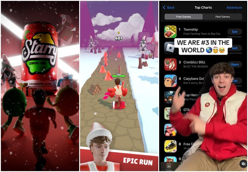还有一款跑酷游戏《Cronblizz Blitz》也在本月闯入了美国iOS免费榜前列。其开发团队mindmush擅长结合热门IP来打造超休闲游戏。《Cronblizz Blitz》的主角便是以TikTok达人okcron为原型,并借助达人的影响力在TikTok传播开来。有趣的是,当前游戏内并无引入任何商业化手段,反而是「Starry汽水」以各种巧妙的方式融入其中,看着倒挺像某品牌的软广。