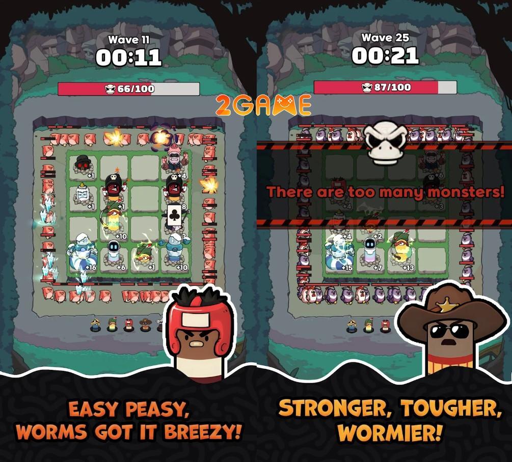 而说到LD like,海外团队也有在跟进。例如,韩国厂商New Normal Soft发行的《No Invade Pls : Defense Game》,自11月数次进入韩国iOS游戏畅销榜TOP100,最高到过第76名。包括引领这股风潮的111%,也仍在探索其他可能性,最近它又测试一款塔防新游《Wormvengers》。与前几作不大一样,新作采用蠕虫题材,玩起来更侧重运气成分——蠕虫升级变成了概率性事件,随着等级提升,升级的成功率越低。