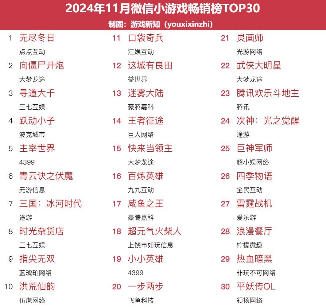 根据引力引擎11月微信小游戏畅销榜TOP30,前三名依旧是点点互动《无尽冬日》、大梦龙途《向僵尸开炮》以及三七互娱《寻道大千》。途游的《三国:冰河时代》稳固在前十,恐怖题材放置MMO《洪荒仙韵》首次进入前十。《口袋奇兵》以往基本保持在20~40名,11月名次上升十多位来到第11名。