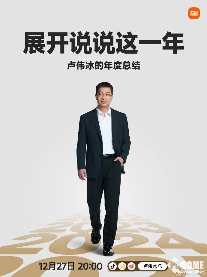 2024年12月26日,小米集团合伙人、总裁、手机部总裁、小米品牌总经理卢伟冰在社交媒体平台发文称,2024年余额还剩5天,12月27日20:00将开一场直播。