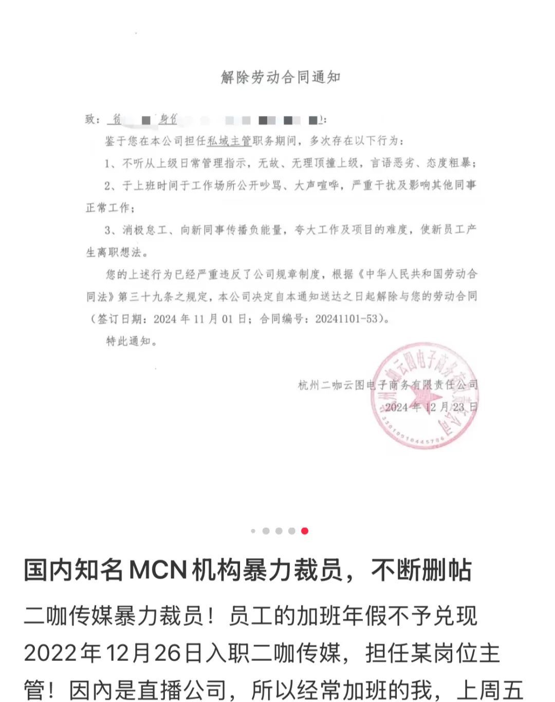 从该网友发布的《接触劳务合同通知》来看,二咖传媒也有列出辞退该名员工的说明。《接触劳务合同通知》指出,该网友在二咖传媒担任私域主管职务期间,多次存在违反公司规章制度的行为:无故、无理顶撞上级;上班期间在工作场所大声喧哗;消极怠工,向新同事传播负能量。故二咖传媒根据《中华人民共和国劳动合同法》第三十九条之规定与该网友解除劳动合同。