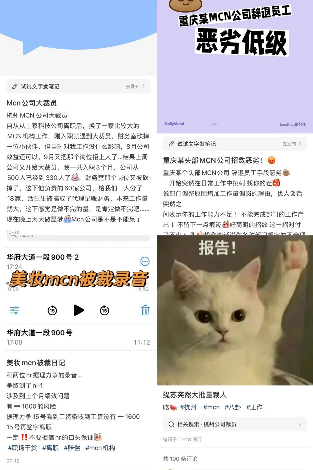 不过,今年裁员的MCN机构并非二咖传媒一家,包括有网友披露重庆某MCN机构辞退员工、MCN公司大裁员、美妆MCN被裁录音等内容。甚至在11月底还有网友直指缇苏突然大批量裁员,岗位涉及运营、客服等。