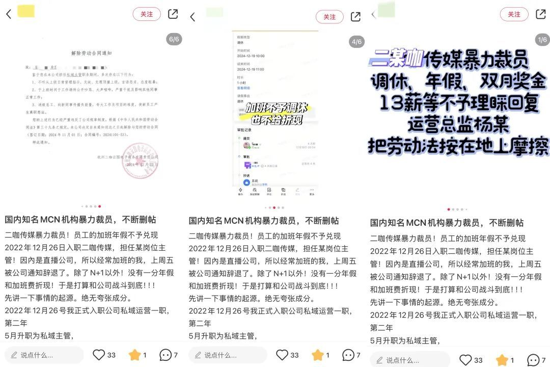从笔记内容来看,该名网友自称系2022年12月26日入职二咖传媒,在上周五被二咖传媒通知辞退,曾担任某岗位主管的一名前员工。该名网友还表示在职期间经常加班,但除了N+1以外,对于调休、年假、双月奖金、13薪等未有回复,包括带有病假单的病假不批、加班不予调休且也未折现。