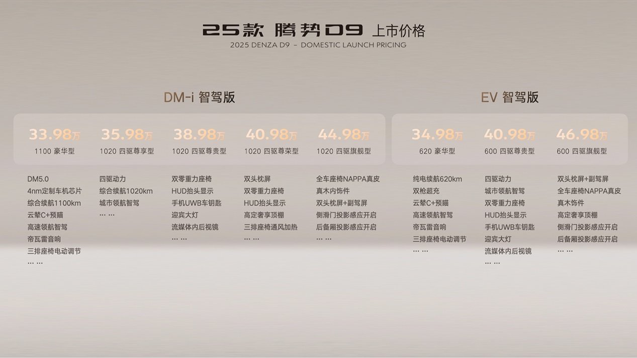 12月26日,“科技豪华全能旗舰MPV”——25款腾势D9重磅上市,推出DM-i超级混动版和纯电版共8个版本车型,官方指导价33.98万元——46.98万元。25款腾势D9在“设计、舒适、驾驭、三电、智能、安全”6大维度全面升级,开创中国新能源豪华MPV新高度!