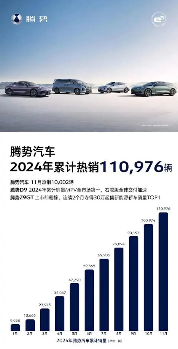从市场前景来看 ,目前腾势品牌在2024年的市场表现可圈可点,11月单月销量突破1万台大关,达到10002辆,品牌2024年累计销量已达110976辆,足以证明品牌的号召力。