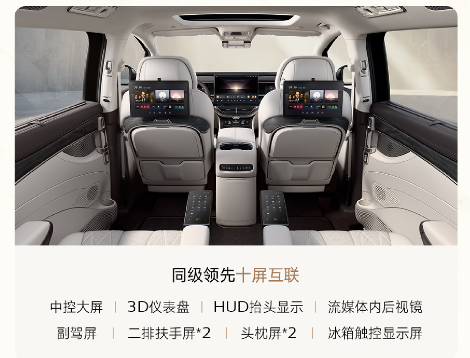有意思的是,这次车内采用多屏互联交互形式,可实现全球领先10屏互联,从前排到后排都安排得明明白白的,连扶手上都给你安排上了屏幕,这配置说真的,有点“装逼利器”的意思了。