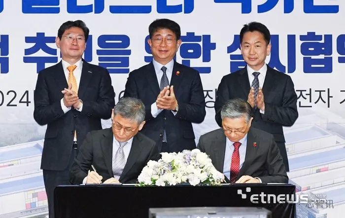 △三星电子 DS 事业部总裁 Kim Yong-kwan(前排左)和韩国土地住宅公社总裁 Lee Han-jun 在签署协议