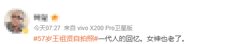 看到王祖贤的自拍,有网友感慨女神状态依旧很美,也有网友质疑,王祖贤面部略显僵硬,是否是受到医美影响。还有网友表示年龄增长状态变化是正常的事,不必太过苛刻。众人也是纷纷感慨,岁月不饶人,即便是一代女神,也有老去的一天。
