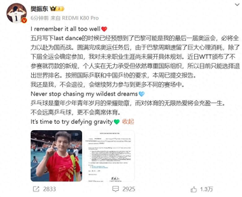 樊振东称:“我还是我,不会退役,会继续努力参与到更多不同的赛场中。Never stop chasing my wildest dreams.乒乓球是童年少年青年岁月的荣耀勋章,而对体育的无限热爱将会充盈一生。不会远离乒乓球,更不会离席体育。It’s time to try defying gravity.”