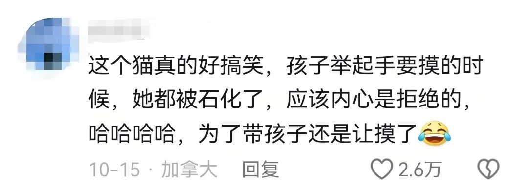 “这个猫真的好搞笑,孩子举起手要摸的时候,它都被石化了,应该内心是拒绝的,为了带孩子还是让摸了。”