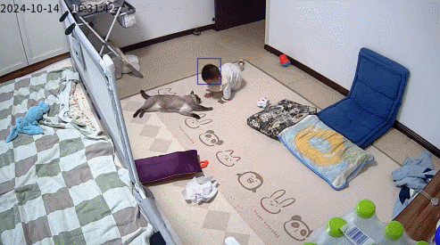 要不说暹罗猫是专业的呢,它一进去就熟门熟路趴在垫子上翻肚肚,打着滚陪孩子玩。