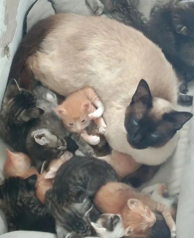 “两窝一共13只小猫崽,没有一只是它自己的,都是死对头的。结果猫崽子们满月之后它瘦了两斤,每一只小孩都舔的干干净净。”