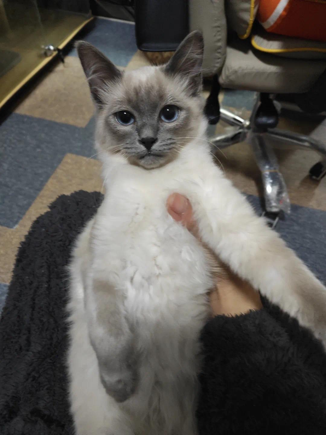 “一只10个月大的小暹罗,到家第三天就开始帮家里的大猫埋屎,它甚至还没有那个猫砂盆高,艰难地爬进去埋比自己脑袋都大颗的屎。”
