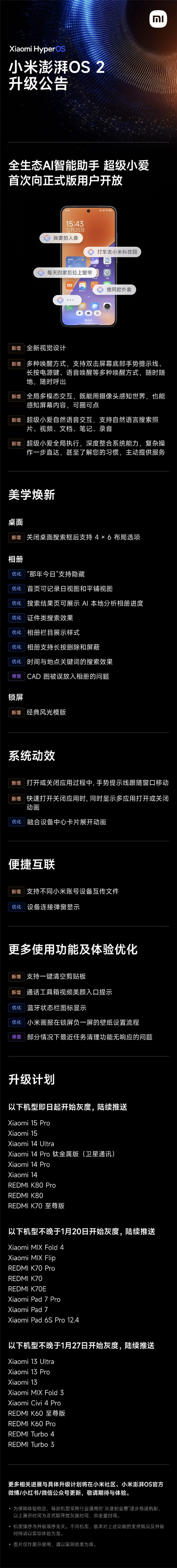 据悉,此次超级小爱的升级将首先面向小米15和REDMI K80系列的用户开放尝鲜。随着技术的不断发展和用户需求的不断变化,小米将继续致力于提升超级小爱的功能和体验,为用户带来更加智能、便捷的生活体验。