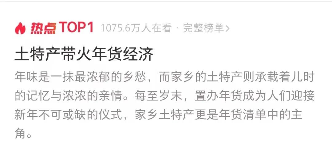 在当下的消费市场中,一个引人注目的现象正悄然兴起——土特产凭借其独特的魅力,成功带火了年货经济。据小红书热搜数据显示,“土特产带火年货经济”已成为大众关注的焦点,登上了热榜TOP1,关注度超过1075.6万人。这一现象不仅仅反映了土特产在年货市场中的受欢迎程度,更蕴含着深厚的经济与文化意义。年味,是一抹最浓郁的乡愁;而家乡的土特产,则承载着儿时的记忆与浓浓的亲情。