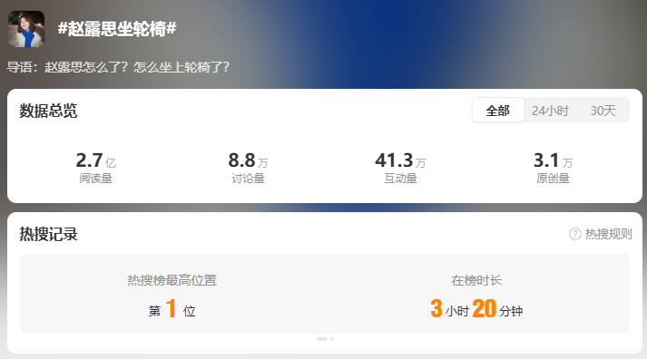 12月27日,#赵露思坐轮椅#一度登上微博热搜第一,相关话题引发热议。
