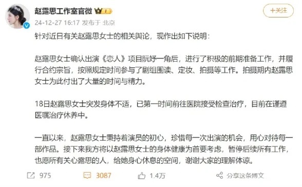 “一直以来,赵露思女士秉持着演员的初心,珍惜每一次出演的机会,用心对待每一部作品。接下来我方将以赵露思女士的身体健康为首要考虑,暂停后续所有工作,也愿所有关心露思的人,给她身心休息的空间,谢谢大家的理解体谅。”