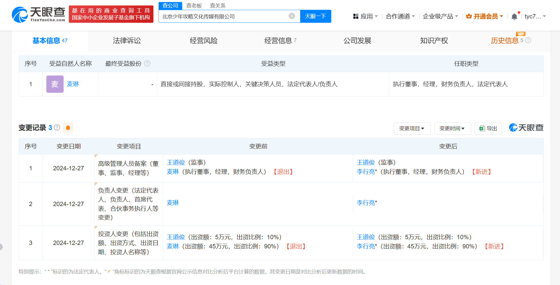 12月27日,据天眼查APP,北京少年攻略文化传媒有限公司进行了工商变更。麦琳卸任法定代表人、执行董事、经理和财务负责人,并退出股东行列,这些职务均由李行亮接任。麦琳在退出前持有公司90%的股份,为第一大股东。