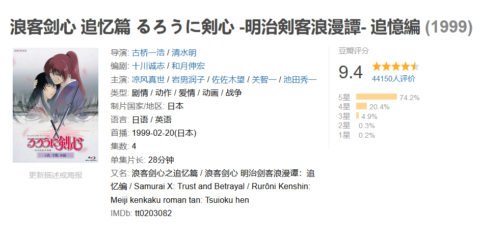但幸好,他以原作漫画的《追忆篇》为蓝本,制作了OVA《浪客剑心 追忆篇》,成功逆转了口碑。