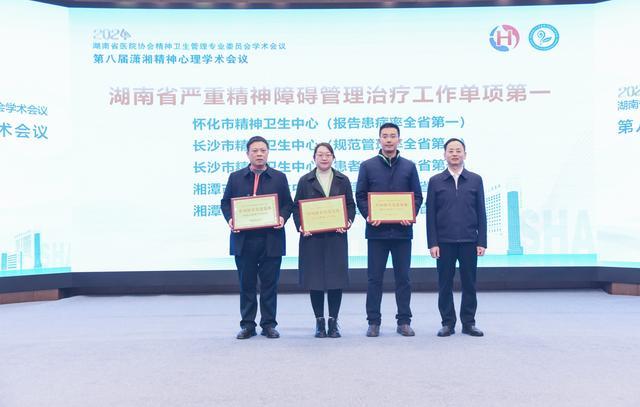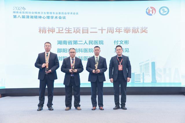 会议分别对湖南省严重精神障碍管理治疗综合评分前五名的市州、对湖南省严重精神障碍管理治疗工作单项第一的市州精神卫生中心进行颁奖表彰,为付文彬、王瑞见、何继岳三位专家颁发湖南精神卫生项目二十周年奉献奖。
