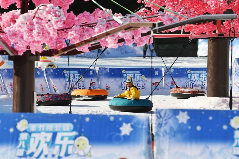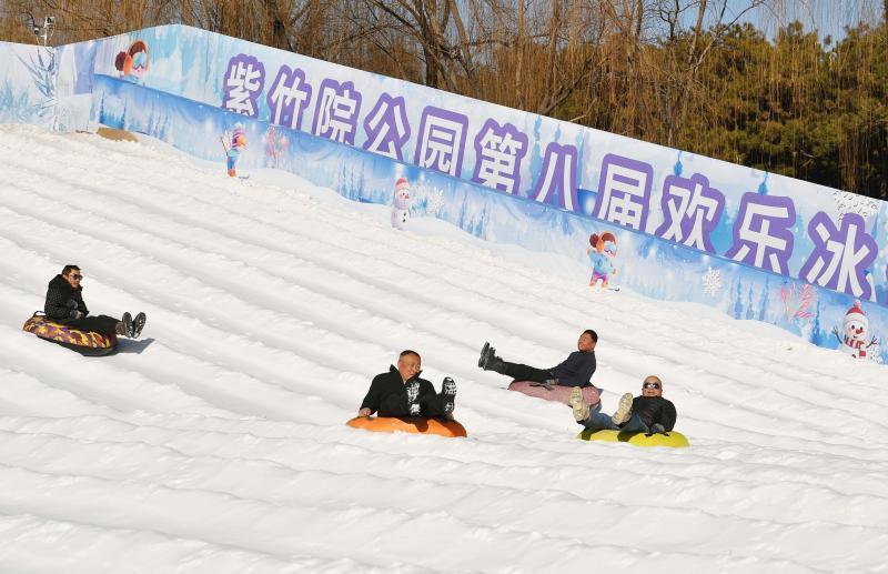 雪上飞碟和网红冰滑梯颇受市民游客喜爱。紫竹院公园配备 18 条滑雪道,游客坐在雪圈上从顶端飞驰而下,耳边风声呼啸,可滑行数十米之远,尽享雪上飞驰的畅快淋漓。票价10元的网红冰滑梯高6米、长70米,其滑道晶莹剔透,游客从高处飞速滑落,可以尽情体验风驰电掣之感,畅享冰雪世界的速度与激情。
