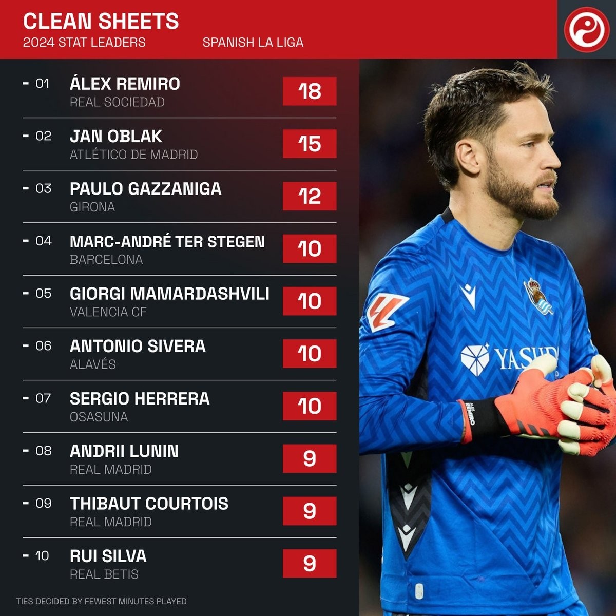 西甲已经结束了2024年的所有比赛,在2024年西甲门将零封榜上,皇家社会门将雷米罗以18次居首,马竞门将奥布拉克以15次零封排名第二。