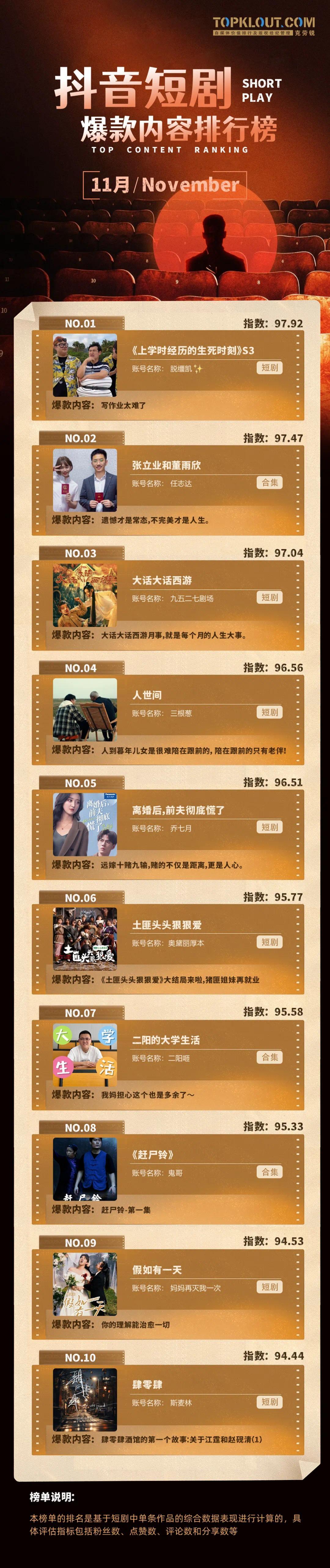 随着内容生态丰富繁荣,一些新的内容方向开始出现,以满足不同观众需求。据克劳锐发布的11月《抖音短剧爆款内容排行榜》(具体榜单见文末)《上学时经历的生死时刻》《张立业和董雨欣》《大话大话西游》凭借热度,稳居榜单前三。