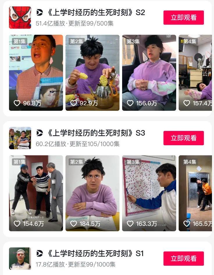 《上学时经历的生死时刻》便是其中的代表。这部短剧聚焦于校园生活,一人分饰多角的创作模式,通过不同角色之间的碰撞冲突上演了一场场让人忍俊不禁的校园大戏。