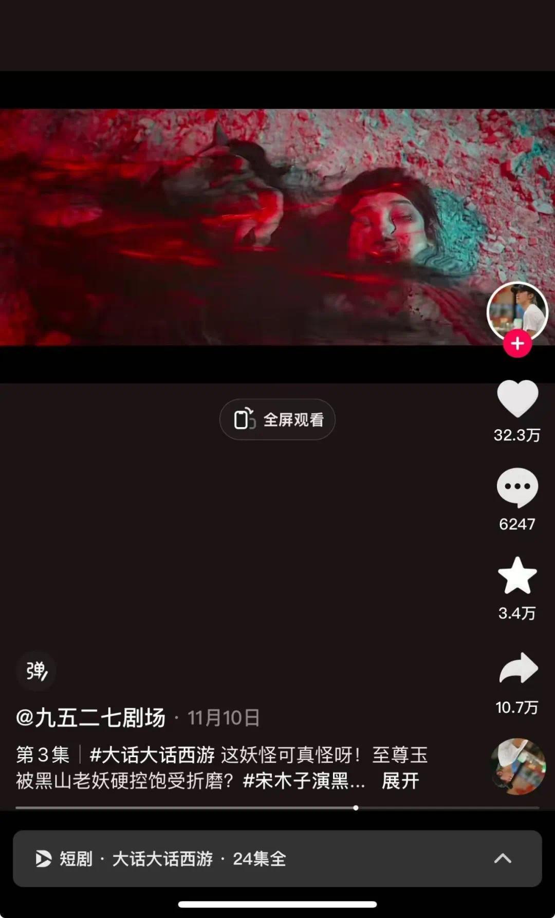 此外,虽然短剧的时长短、制作周期快,但观众对画面品质的要求并未降低。如今,越来越多的短剧通过AR、CG等视觉特效技术,让短剧的画面表现力接近电影级别。
