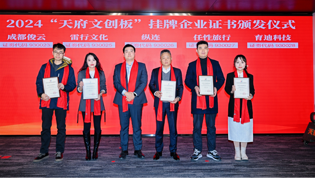 12月27日,2024“天府文创板”企业挂牌仪式暨成都文创金融银企交流会在成都举行,成都俊云科技有限公司、四川雷行文化产业集团有限公司、成都纵连展会物流有限公司、成都任性旅行社有限公司、成都育迪科技有限公司成功挂牌。