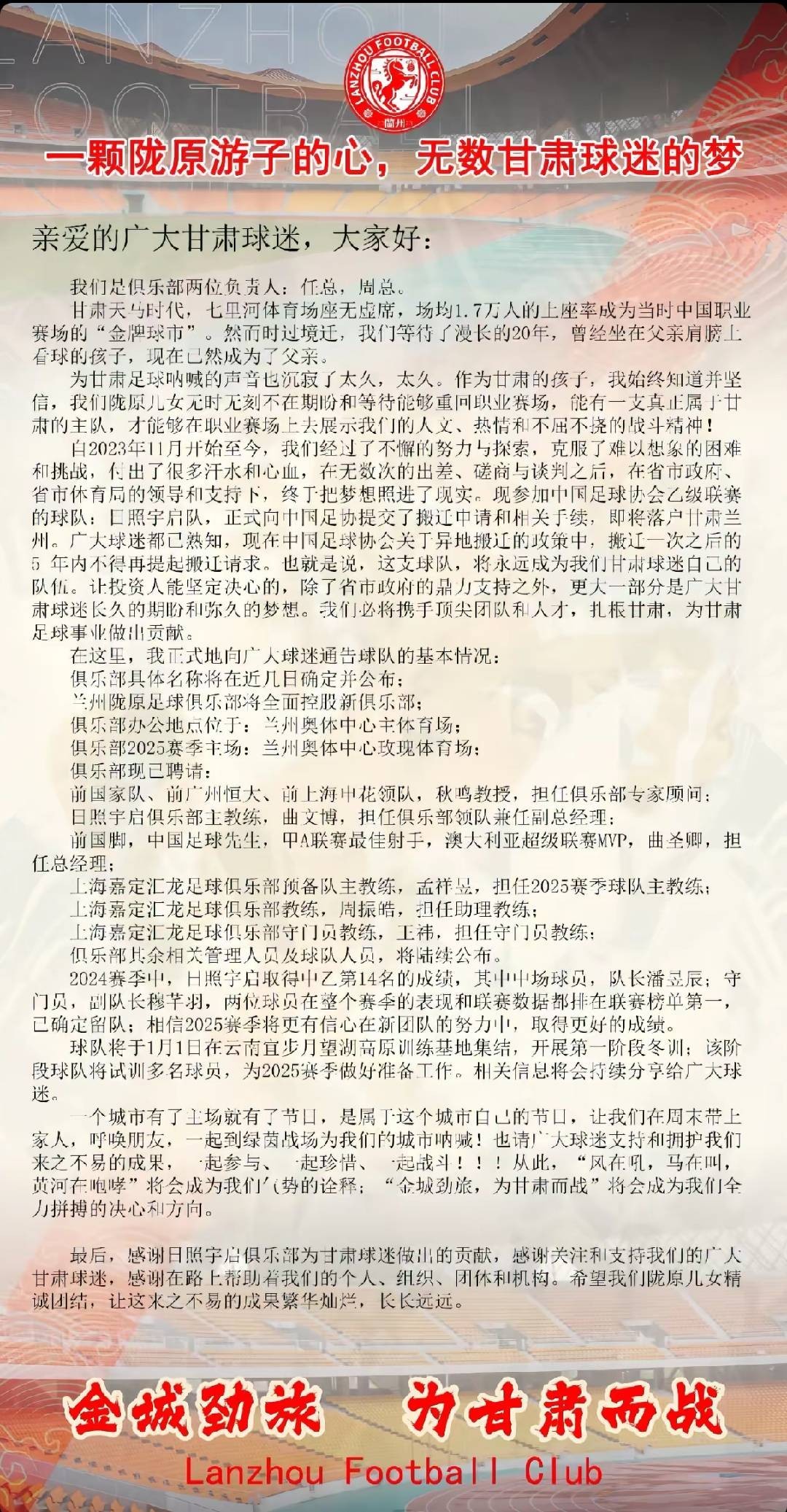 抖音账号“LanzhouFootballClub”发布消息,日照宇启已经搬迁至兰州,嘉定汇龙预备队主帅孟祥昱担任主教练。
