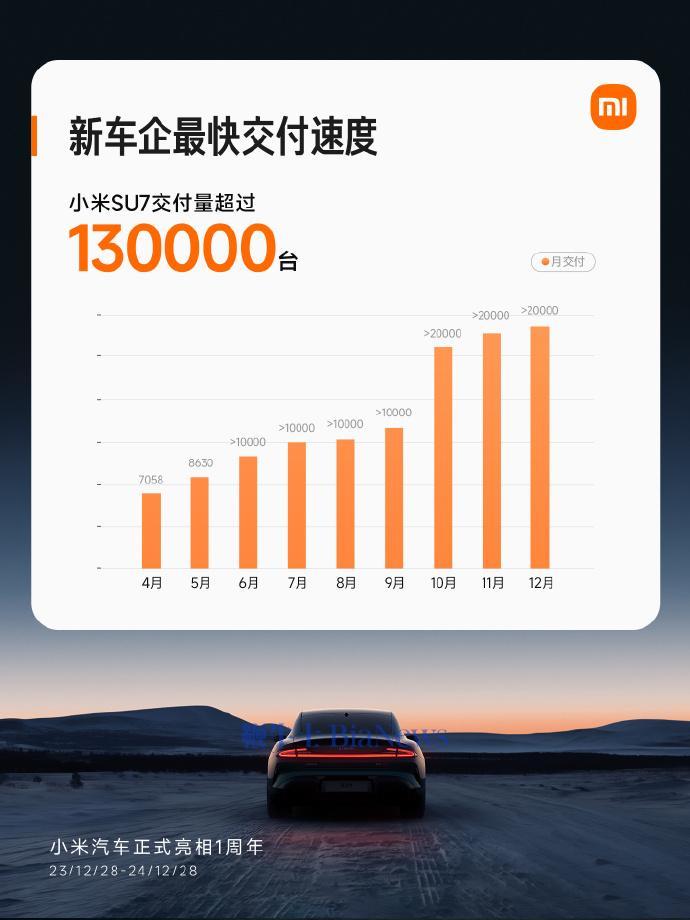 鞭牛士 12月28日消息,小米汽车今日宣布,截至目前,小米SU7全年交付量已超过13万,已提前完成全年所有目标。